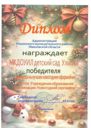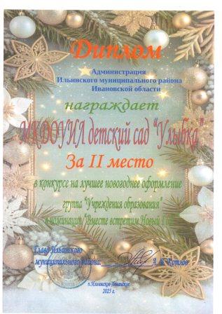 В волшебном предчувствии новогодних и рождественских чудес администрация Ильинского муниципального района распахнула двери для конкурса на лучшее новогоднее оформление. И вот, словно яркая звездочка, среди множества претендентов засиял МКДОУИЛ детский сад «Улыбка», покорив сердца жюри и стал победителем в номинации «Новогодний серпантин»! Не остановившись на достигнутом, детский сад пленила своим очарованием и в номинации «Вместе встретим новый год», удостоившись второго места.