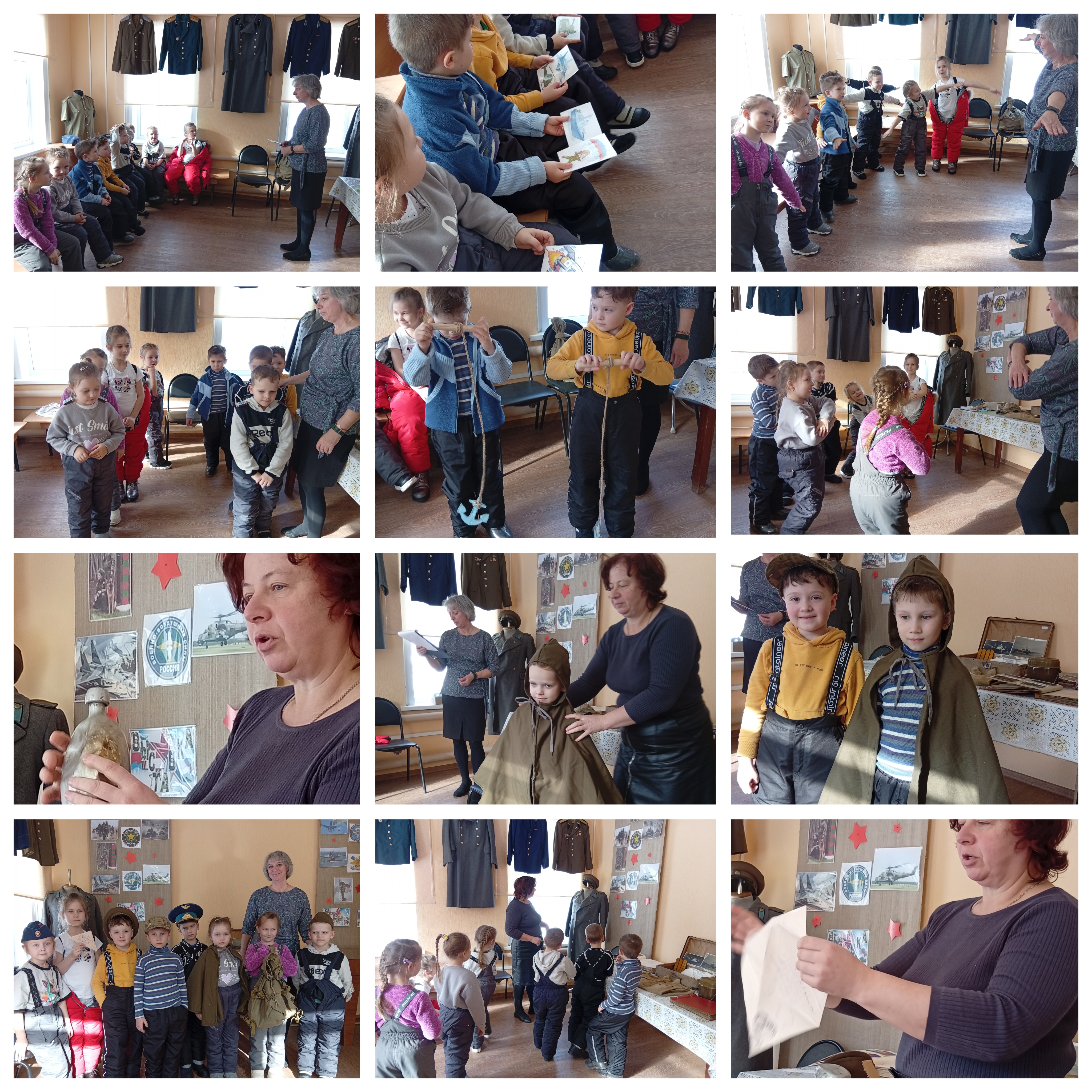Дети подготовительной группы «Улыбка» посетили выставку «Время героев», которую провели для ребят сотрудники Пестяковского краеведческого музея Н.В.Девяткина и С.А.Шевардина. Для детей были продемонстрированы: военная одежда, атрибуты времён ВОВ. Дети играли в дидактические и подвижные игры военной тематики.