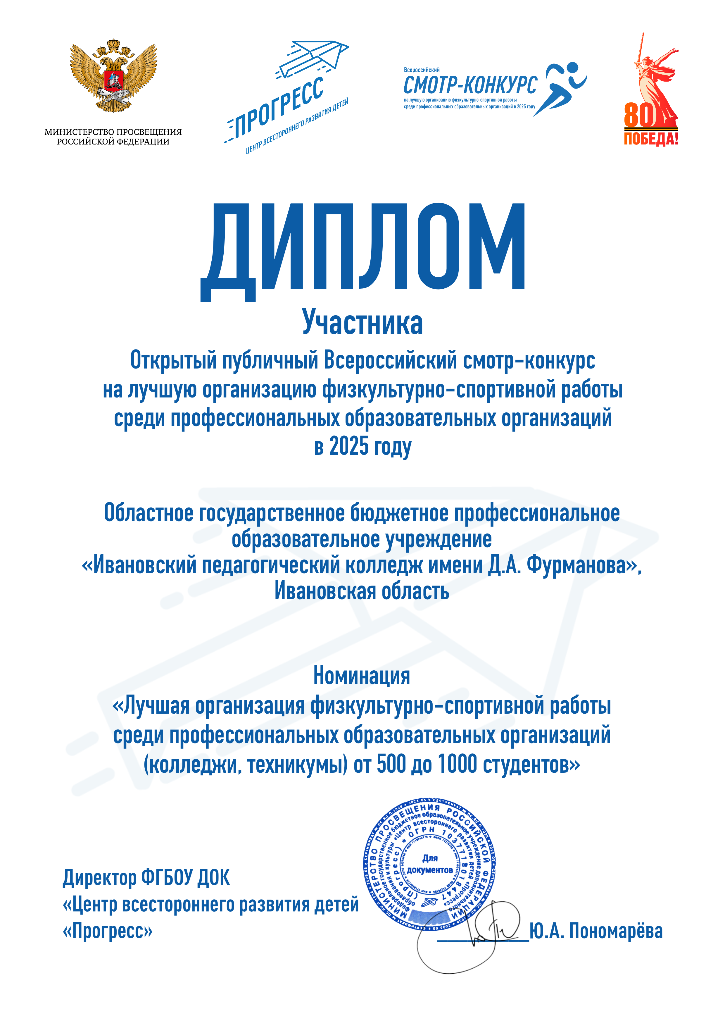 Осенью 2025 года ОГБПОУ Ивановский педагогический колледж стал участником Открытого публичного Всероссийского смотра-конкурса на лучшую организацию физкультурно-спортивной работы среди профессиональных образовательных организаций в 2025 году. Конкурс проводился в соответствии с пунктом 18 План мероприятий по реализации межотраслевой программы развития студенческого спорта на период до 2030 года.