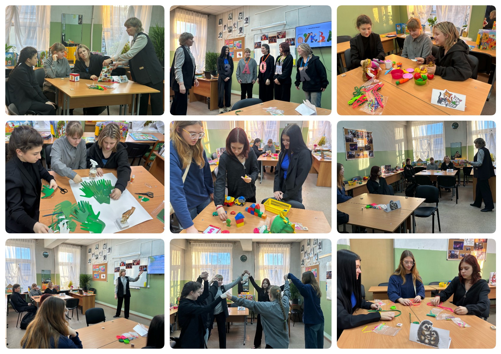 В рамках мероприятия старшеклассники приняли участие в решении предложенных ситуативных задач, испытали себя в организации подвижных и развивающих игр для дошкольников, попытались организовать сюжетно-ролевые игры, выполнили коллективную творческую работу. Это позволило сформировать представление о некоторых формах профессиональной деятельности воспитателя детского сада.