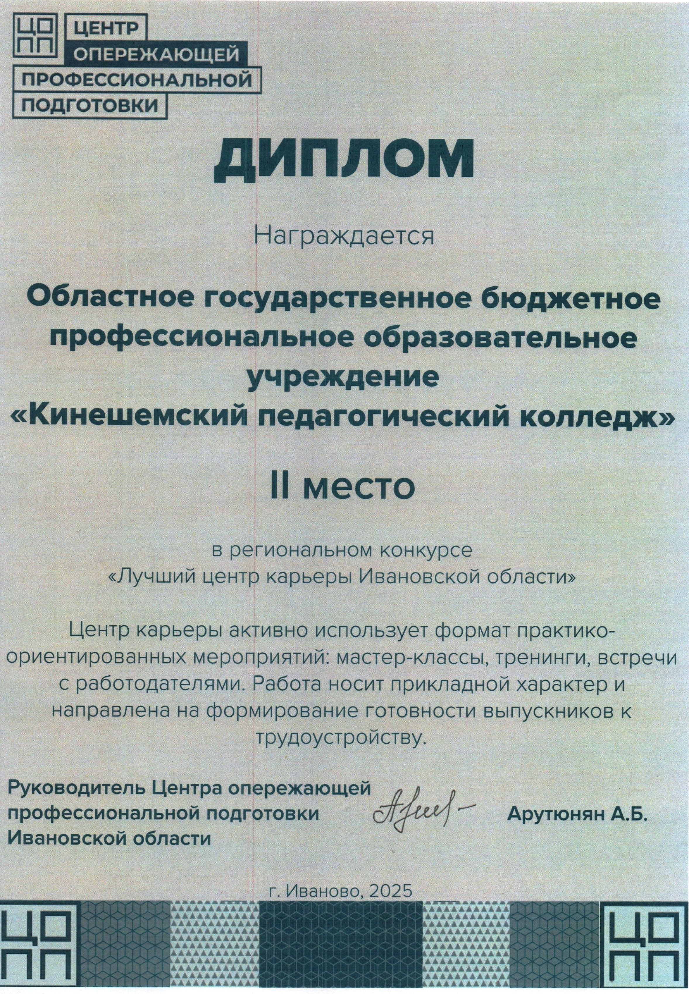 В Центре опережающей профессиональной подготовки подведены итоги регионального конкурса «Лучший центр карьеры Ивановской области». Центр карьеры Кинешемского педагогического колледжа, руководитель заместитель директората по учебно — производственной работе Л.В. Афанасьева, занял в конкурсе 2 место. Центр карьеры колледжа ведёт большую работу по трудоустройству выпускников колледжа. При подведении итогов отмечена практико – ориентированная и прикладная направленность работы Центра по формированию готовности выпускников к трудоустройству по выбранной профессии.