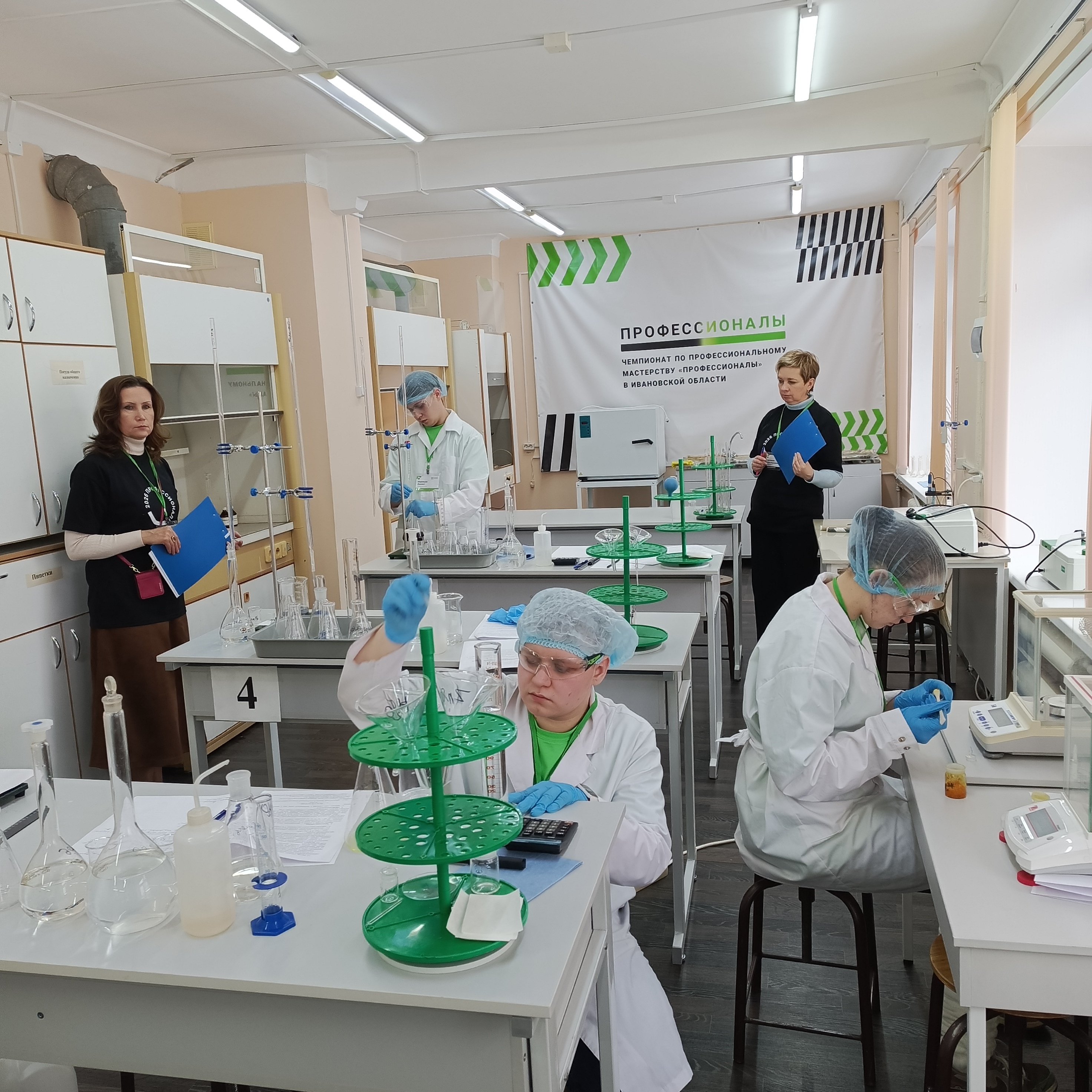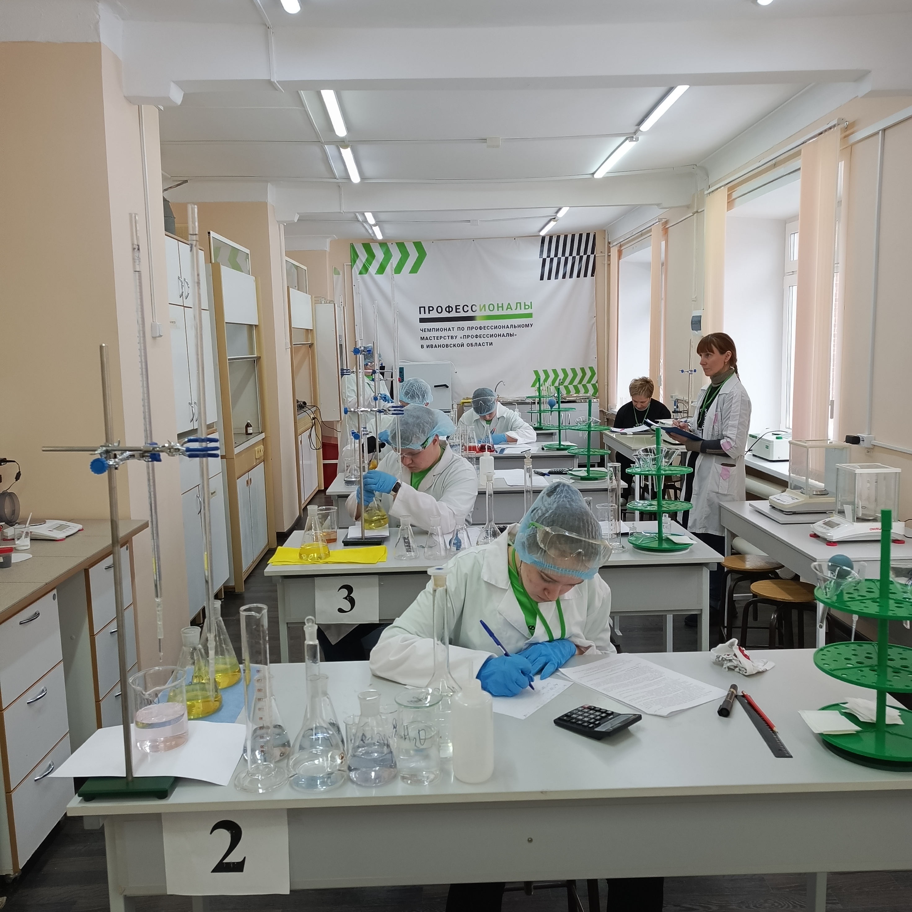Участники чемпионата выполняют конкурсное задание – Определение содержания алюминия и железа в их смеси титриметрическим методом.