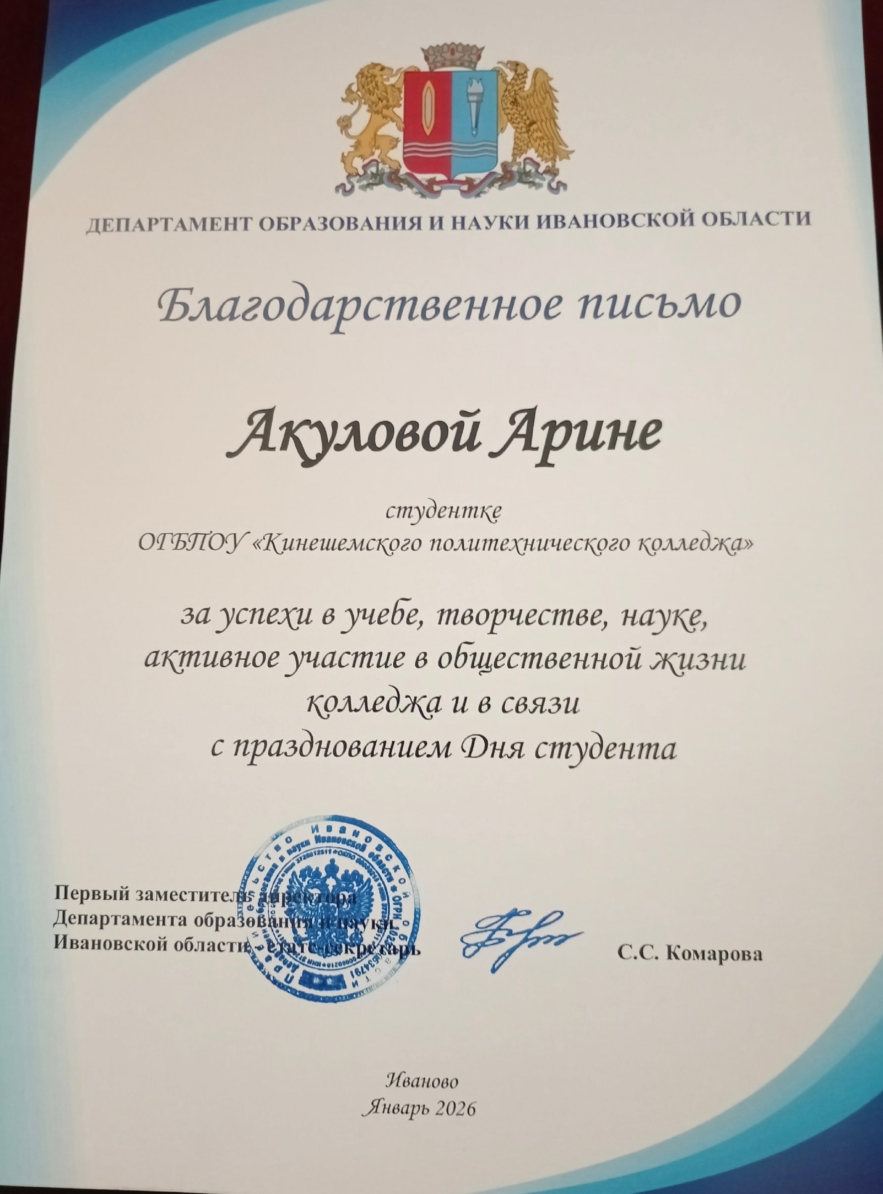Накануне Дня российского студенчества в Иванове поощрили студентов Кинешемского политехнического колледжа ✨