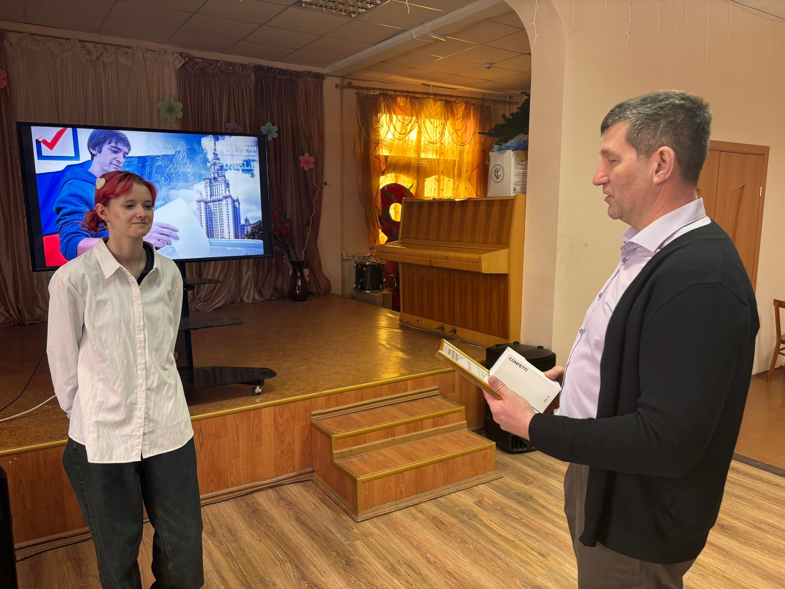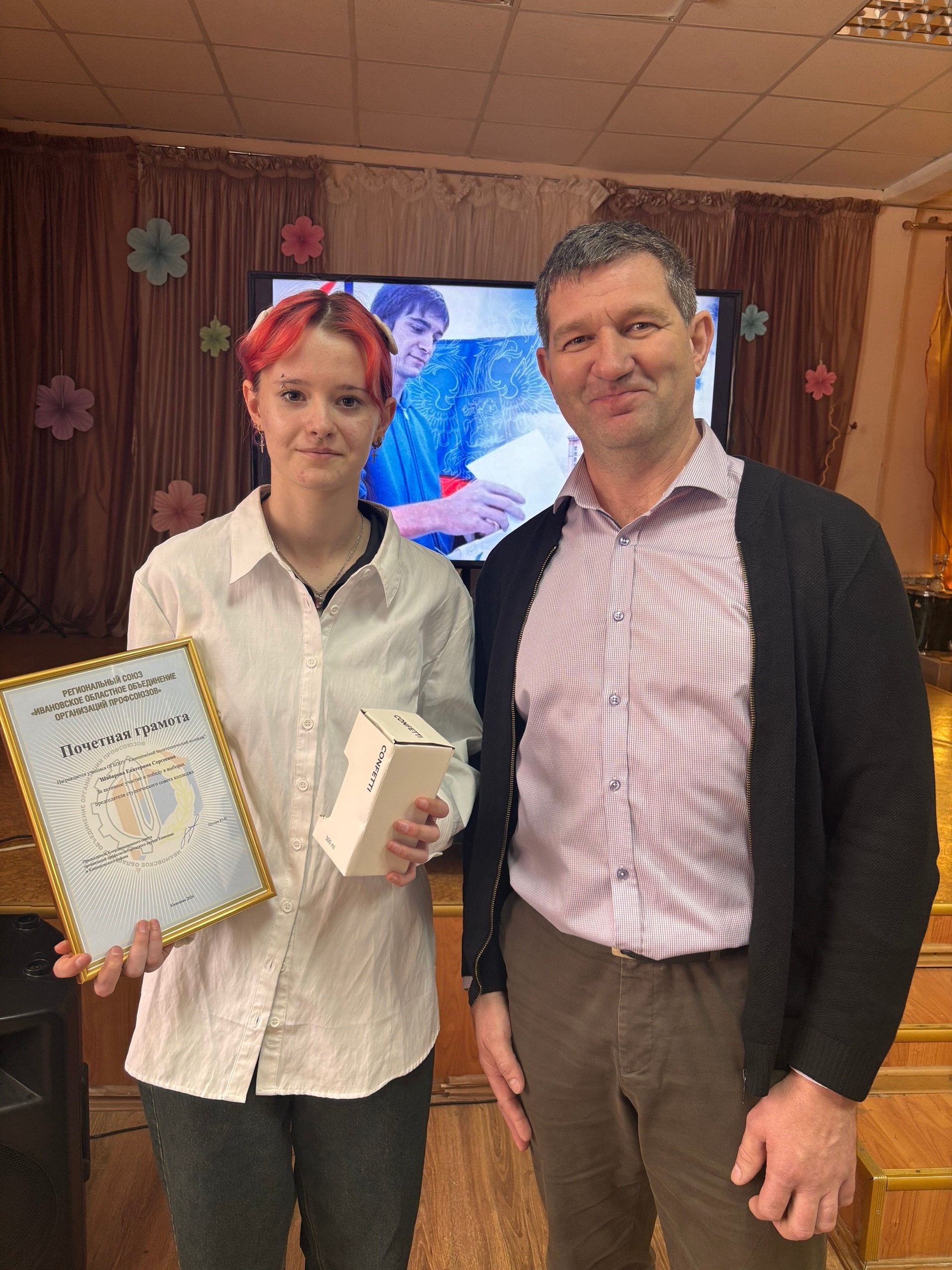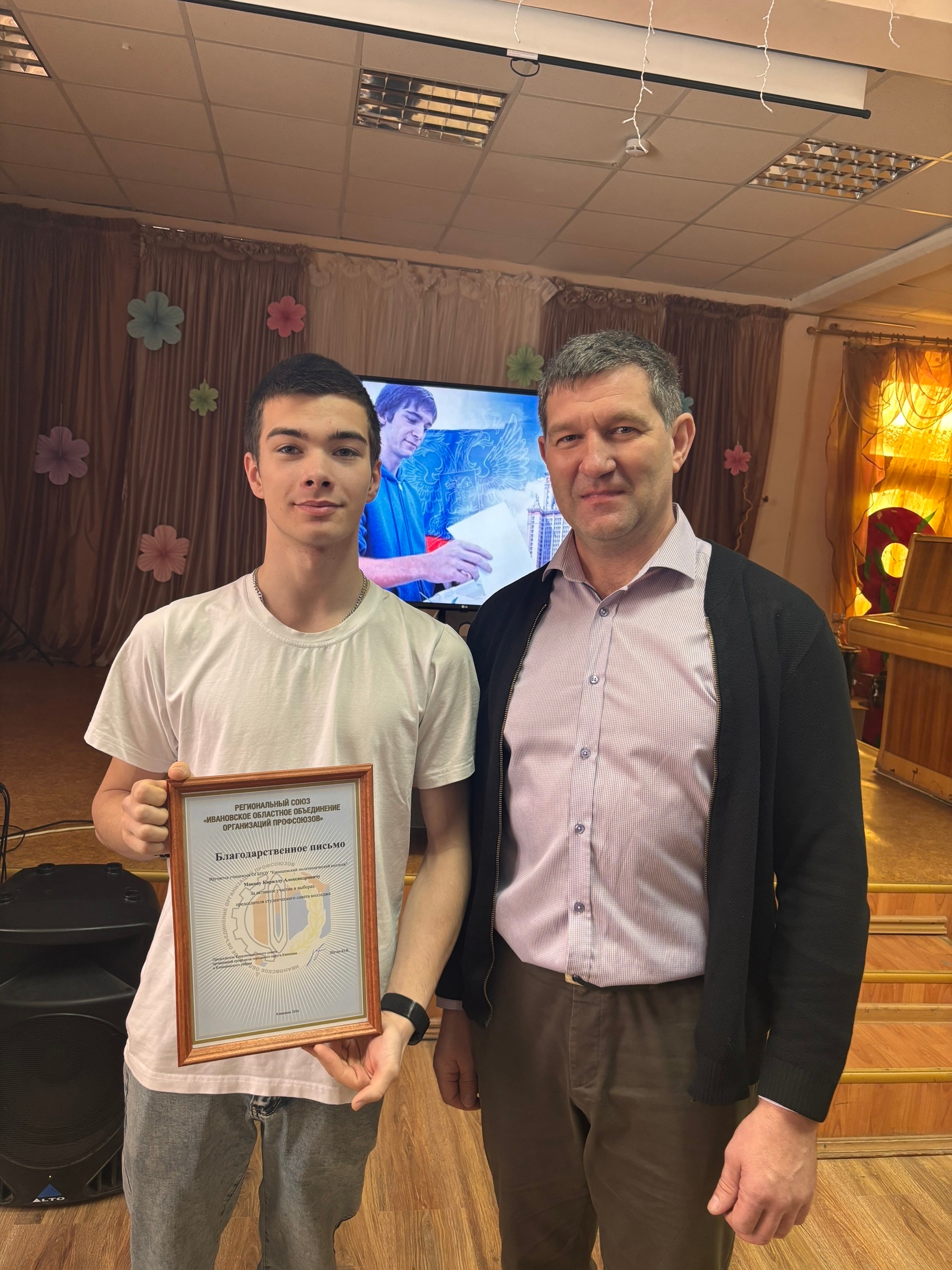 ☝ ❗Объявление результатов выборов председателя студенческого совета 👏 Объявляем имя кандидата, одержавшего победу на выборах председателя Студенческого совета 2026 года. Новым председателем студенческого совета становится Екатерина Шабарова! Поздравляем Катю👏 Свои поздравления Екатерине выразил председатель Координационного совета организаций профсоюза городского округа Кинешма и Кинешемского района Юрий Шутин, вручил ей Почетную грамоту. Он пожелал Екатерине воплотить в жизнь свою предвыборную платформу и не останавливаться на достигнутом. Также Юрий Владимирович поздравил участников выборов, которые немного уступили девушке — Кирилла Макова и Алексея Кичигина, вручив им благодарственные письма. Предвыборная гонка завершена, выборы состоялись. Студенты продемонстрировали свою высокую заинтересованность в выборном процессе, некоторые уже решили принять участие в выборах в следующем году уже в качестве кандидата на пост главы студенческого сообщества колледжа.